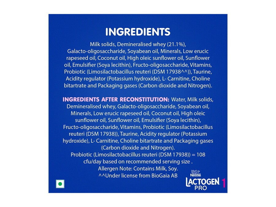 Milk solids, Demineralised whey (21.1%), Galacto-oligosaccharide, Soyabean oil, Minerals, Low erucic rapeseed oil, Coconut oil, High oleic sunflower oil, Sunflower oil, Emulsifier (Soya lecithin), Fructo-oligosaccharide, Vitamins, Probiotic (Limosilactobacillus reuteri (DSM 17938^^)), Taurine, Acidity regulator (Potassium hydroxide), L- Carnitine, Choline bitartrate and Packaging gases (Carbon dioxide and Nitrogen). INGREDIENTS AFTER RECONSTITUTION: Water, Milk solids, Demineralised whey, Galacto-oligosaccharide, Soyabean oil, Minerals, Low erucic rapeseed oil, Coconut oil, High oleic sunflower oil, Sunflower oil, Emulsifier (Soya lecithin), Fructo-oligosaccharide, Vitamins, Probiotic (Limosilactobacillus reuteri (DSM 17938)), Taurine, Acidity regulator (Potassium hydroxide), L- Carnitine, Choline bitartrate and Packaging gases (Carbon dioxide and Nitrogen). Probiotic (Limosilactobacillus reuteri (DSM 17938)) = 10^8 cfu/day based on recommended serving size. Allergen Note: Contains Milk, Soy.^^Under license from BioGaia AB